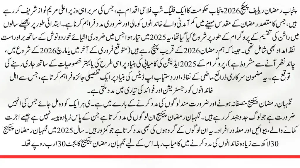 The Punjab Nigehban Ramzan Relief Package 2026 is a flagship welfare initiative by the Punjab Government, spearheaded by Chief Minister Maryam Nawaz Sharif, aimed at providing financial and essential support to low-income families during the holy month of Ramadan.