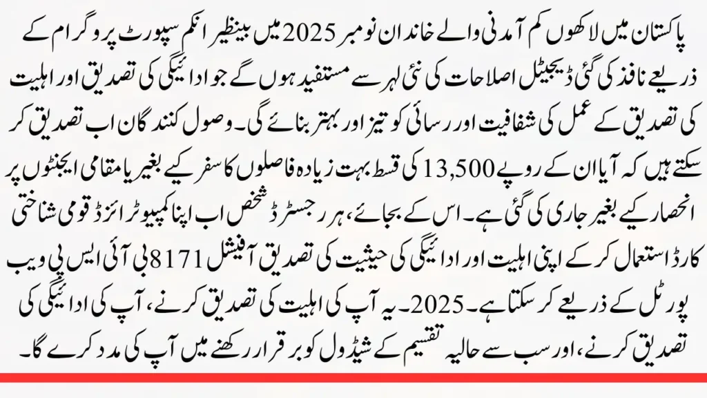 Millions of low-income families in Pakistan will benefit from a new wave of digital reforms implemented by the Benazir Income Support Program in November 2025 that will speed up and improve the transparency and accessibility of the payment verification and eligibility confirmation process. Recipients can now verify whether their Rs. 13,500 installment has been released without having to travel great distances or rely on local agents.Instead, each registered person can now use their Computerized National Identity Card (CNIC) to verify their eligibility and payment status online through the official 8171 BISP web portal.This article offers a comprehensive, step-by-step tutorial on how to use the 8171 portal in November 2025. It will assist you in confirming your eligibility, verifying your payment, and keeping up with the most recent disbursement schedule.