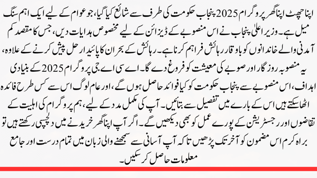 The Apni Chhat Apna Ghar Program 2025 was published by the Punjab government, marking a important milestone for the populace. The Punjab Chief Minister gave specific instructions for this project’s design, which aims to give low-income families decent housing. In addition to offering a sustainable solution to the housing crisis, this plan will boost employment and the province’s economy.Describe in detail the primary goals of the ACAG Program 2025, the benefits this project will bring to the Punjab government, and the ways in which the general public can profit from it. For your full assistance, we will also go over the program’s eligibility requirements and entire registration process. Please read this article through to the end if you’re interested in buying your own home so you can get all the accurate and comprehensive information in easy-to-understand language.