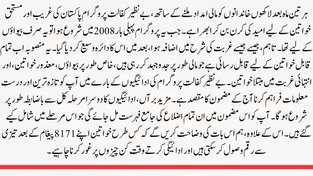 With millions of families receiving financial aid every three months, the Benazir Kafalat Program has emerged as a ray of hope for Pakistan’s impoverished and worthy women. When the program first began in 2008, it was exclusively for widows; however, as the poverty rate rose, its purview was later broadened. The plan is now accessible to all worthy women who are struggling financially, particularly widows, women with disabilities, and women in extreme poverty.Giving you the most recent and accurate information on the Benazir Kafalat Program payments is the goal of today’s article. Additionally, the second phase of payments will formally begin tomorrow. You will find a comprehensive list of all the districts that have been included in this phase in this article. In addition, we’ll explain how women can quickly receive money following their 8171 message and what to consider when making a payment.