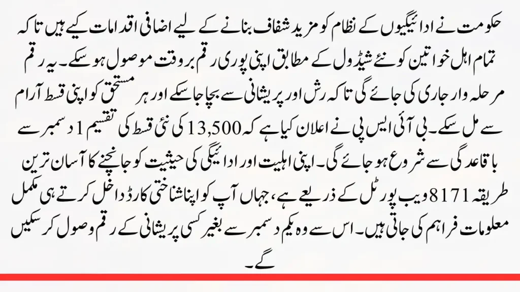 The government has taken additional measures to make the payment system more transparent so that all eligible women can receive their full amount on time in accordance with the new schedule. The amount will be released in phases so that rush and hassle can be avoided and every beneficiary can receive their installment comfortably. BISP has announced that the distribution of a new installment of 13,500 will start regularly on December 1. The simplest way to check your eligibility and payment status is through the 8171 web portal, where you are given complete information as soon as you enter your CNIC. This will allow them to receive the money without any problems starting on December 1.