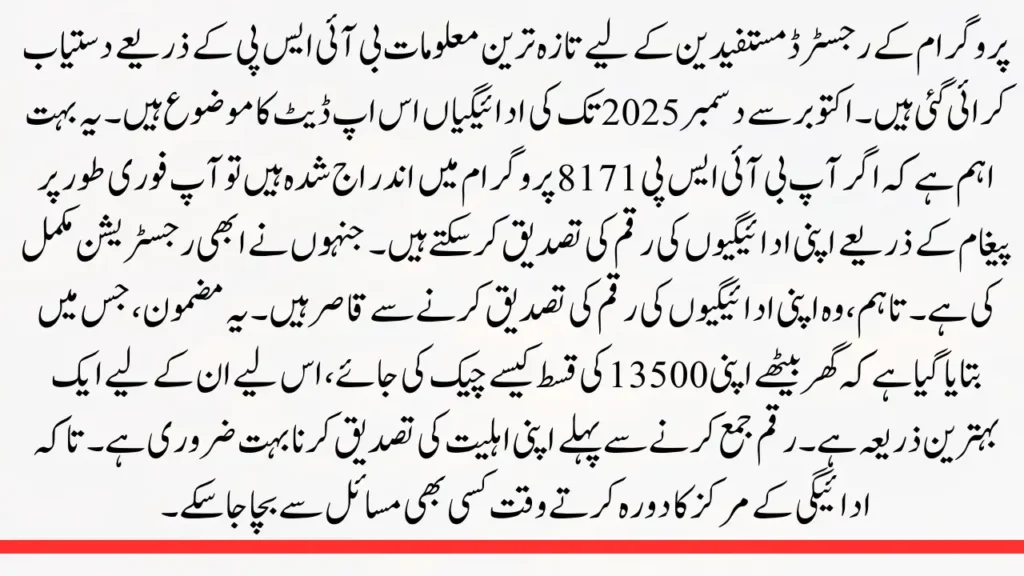 The most recent information for the program’s registered beneficiaries has been made available by BISP. The payments from October to December of 2025 are the subject of this update. It is crucial that you can quickly confirm the amount of your payments via SMS if you are enrolled in the BISP 8171 program. those who just finished registering. However, they are unable to verify the amount of their payments. This article, which explains how to check their 13500 installment at home, is therefore a great resource for them. Verifying your eligibility is crucial before collecting the money. in order to avoid any issues when visiting the payment center.