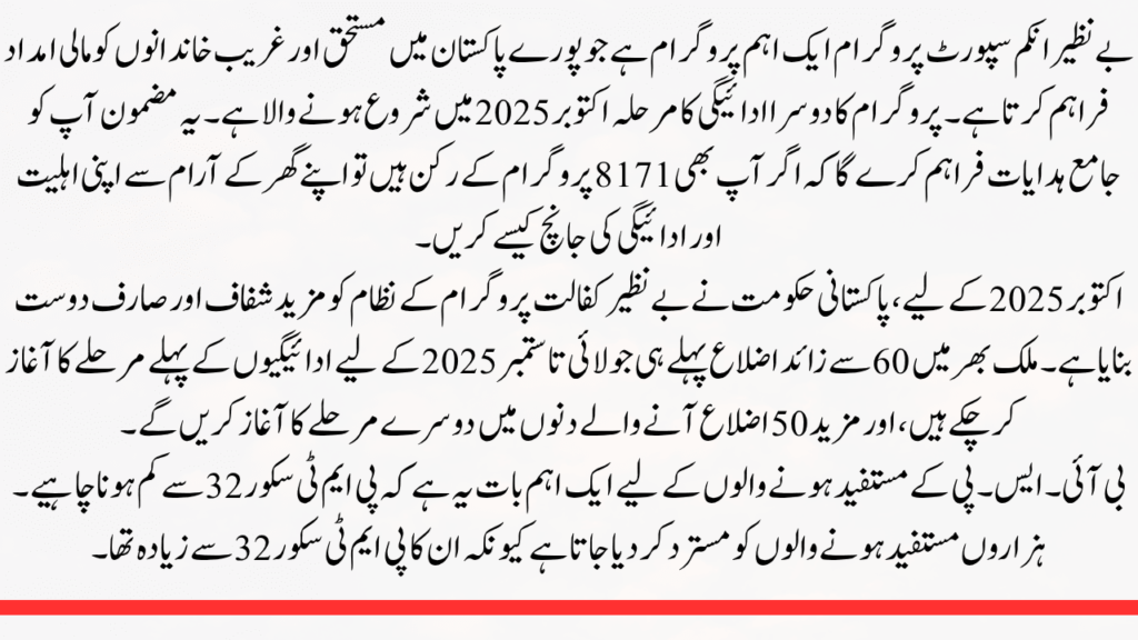 For October 2025, the Benazir Kafalat Program system has been made even more transparent and user-friendly by the Pakistani government. More than 60 districts nationwide have already begun the first phase of payments for July–September 2025, and 50 more districts will begin the second phase in the coming days.