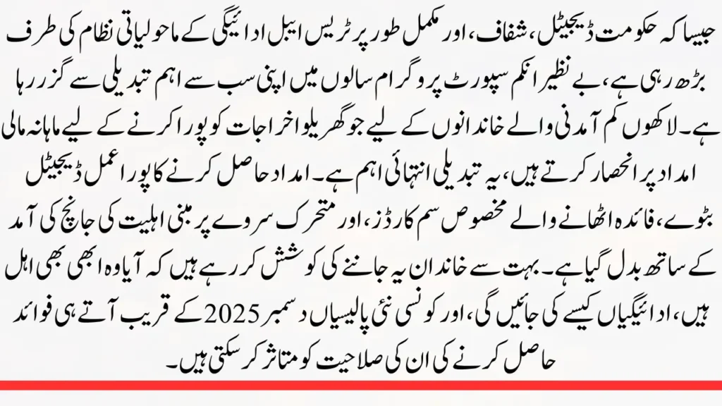 As the government moves toward a digital, transparent, and fully traceable payment ecosystem, the Benazir Income Support Program is going through its most significant change in years. For millions of low-income families who depend on monthly financial aid to cover household expenses, this shift is extremely important. The entire process of getting aid has changed with the advent of digital wallets, beneficiary-specific SIM cards, and dynamic survey-based eligibility checks. Many families are attempting to find out whether they are still eligible, how payments will be made, and what new policies may impact their ability to receive benefits as December 2025 approaches.