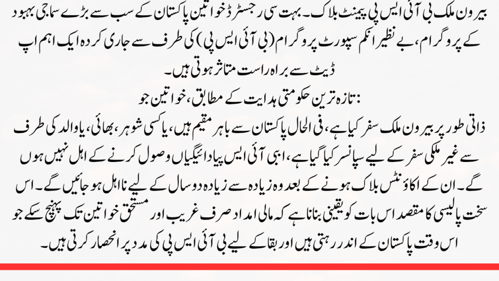 Women Abroad’s BISP Payment Block. Many registered women are directly impacted by a significant update released by Pakistan’s largest social welfare program, the Benazir Income Support Programme (BISP).