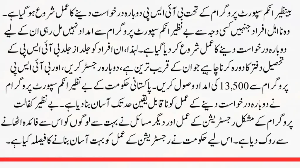 Benazir Income Support Program has started the BISP Reapplication process. The reapplication process has been initiated for those ineligible people who are not getting assistance from the Benazir Income Support Program for any reason. So such persons should go to their nearest BISP tehsil office as soon as possible and re-register and get assistance of 13500 from the BISP program.The reapplication process has made very easy in the Benazir Income Support Program by the Government of Pakistan. Many people have left out of receiving assistance from the Benazir Kafalat program due to the complicated registration process and other problems.