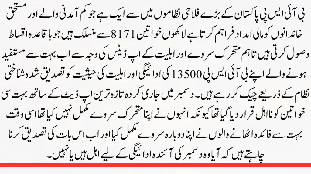 BISP is one of the major welfare systems in Pakistan that provides financial assistance to low-income and deserving families millions of women are linked with the 8171 receive regular installments however due to dynamic surveys and eligibility updates many beneficiaries are now checking their BISP 13500 payment and eligibility status through the official CNIC verification system. With the latest update issued in December a number of women were declared ineligible because they did not complete their dynamic survey at the same time many beneficiaries completed their re-survey and now want to confirm whether they are eligible for the upcoming December payment.