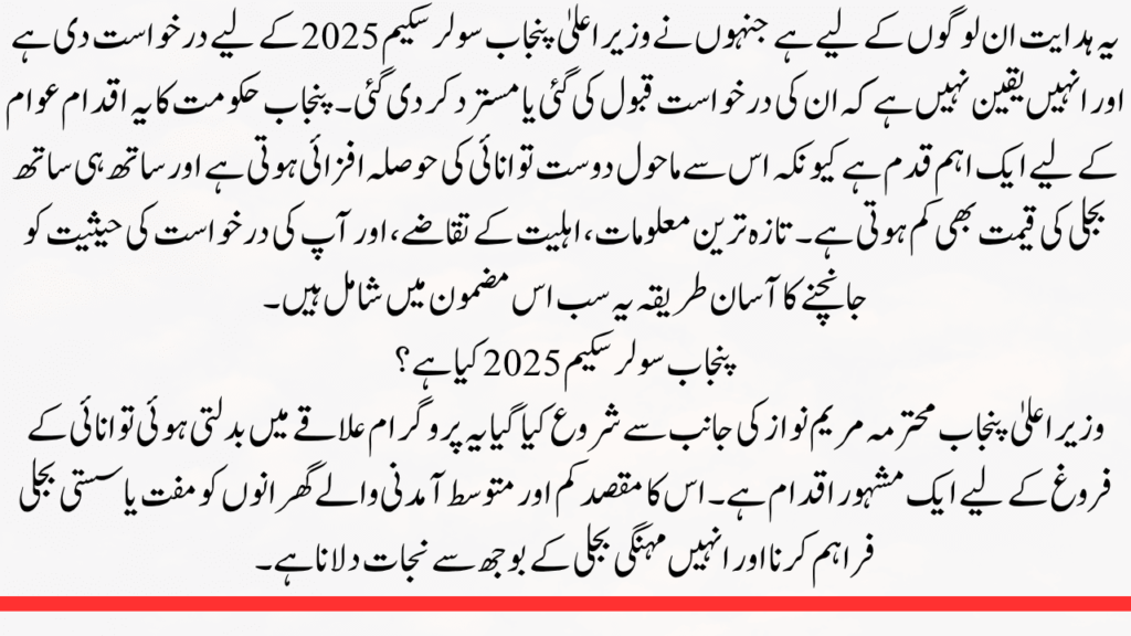 This guideness is for those who have applied for the Chief Minister Punjab Solar Scheme 2025 and are not sure whether their application was accepted or rejected. This initiative by the Punjab government is an important step for the public as it encourages eco-friendly energy and at the same time reduces the cost of electricity. The latest information, eligibility requirements, and an easy way to check the status of your application are all covered in this article.