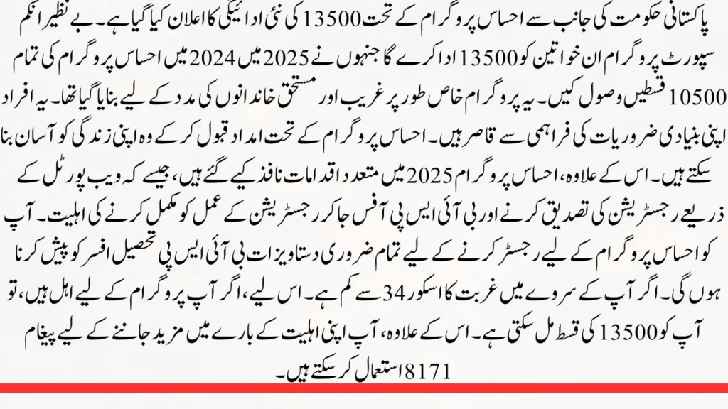 A new payment of 13500 under the Ehsaas Program has been announced by the Pakistani government. The Benazir Income Support Program will pay 13500 to women who received all of the 10500 installments from the Ehsaas Program in 2024 in 2025. This program was created specifically to assist impoverished and worthy families. These individuals are incapable of providing for their basic necessities. By accepting aid under the Ehsaas Program, they can simplify their lives. In addition, a number of measures have been implemented in the Ehsaas Program 2025, such as the ability to verify registration via the web portal and finish the registration process by visiting the BISP office.You must present all necessary documentation to the BISP Tehsil Officer in order to register for the Ehsaas Program 2025. where you must finish the NSER survey. if your survey poverty score is lower than 34. Therefore, if you qualify for the program, you can receive a 13500 installment. In addition, you can use SMS 8171 to learn more about your eligibility.