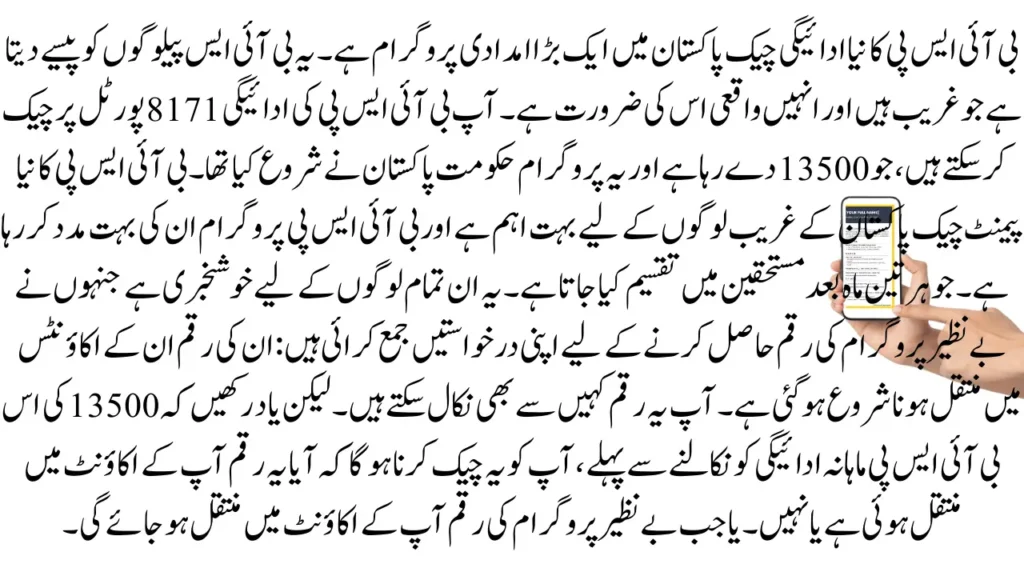 The BISP New Payment Check is a big help program in Pakistan. It gives money to the BISP people who’re poor and really need it. You can check the BISP payment, on the 8171 portal, which is giving 13500 and this program was started by the government of Pakistan. The BISP New Payment Check is very important for the poor people of Pakistan and the BISP program is helping them a lot.which is distributed to the beneficiaries every three months. This is good news for all those who have submitted their applications to get the Benazir program money: Their money has started transferring to their accounts.You can withdraw this money from anywhere. But remember that before withdrawing this BISP monthly payment of 13500, you have to check whether this amount has been transferred to your account or not. Or when the amount of the Benazir program will be transferred to your account.