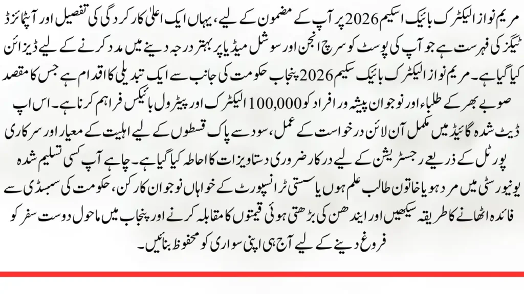 For your article on the Maryam Nawaz Electric Bike Scheme 2026, here is a high-performance SEO description and a list of optimized tags designed to help your post rank better on search engines and social media.