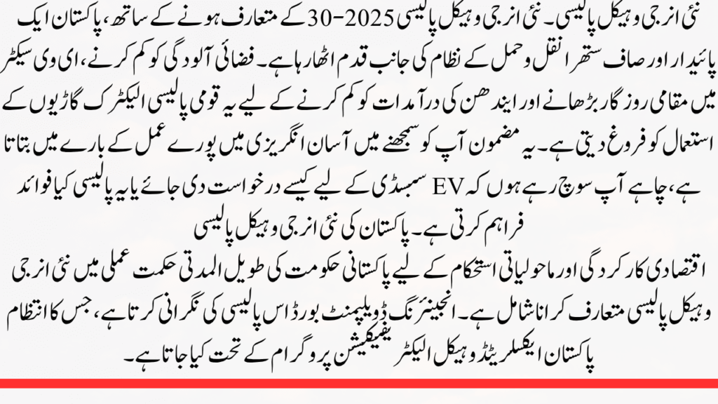 New Energy Vehicle Policy.With the introduction of the New Energy Vehicle (NEV) Policy 2025–30, Pakistan is taking steps toward a sustainable and clean transportation system. In order to decrease air pollution, increase local employment in the EV sector, and decrease fuel imports, this national policy promotes the use of electric vehicles (EVs).
