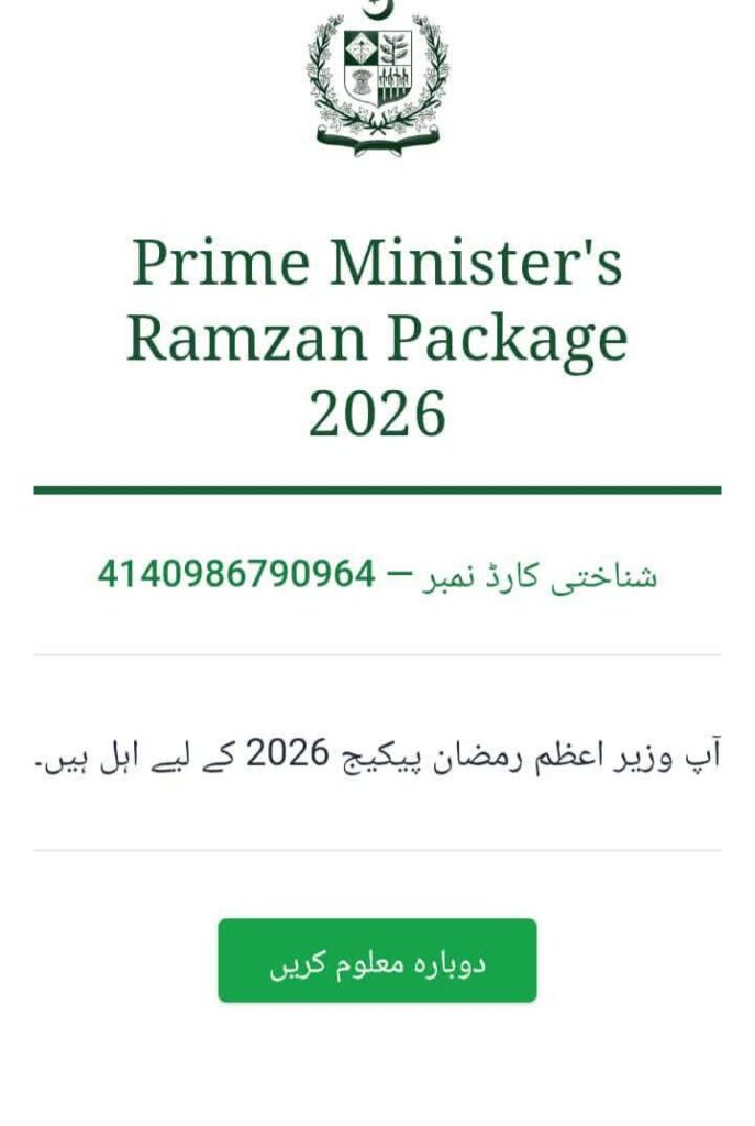 4. Submit and View Status: Click the “Check Eligibility” (معلوم کریں) button. The portal will instantly display your eligibility status for the Ramadan package.